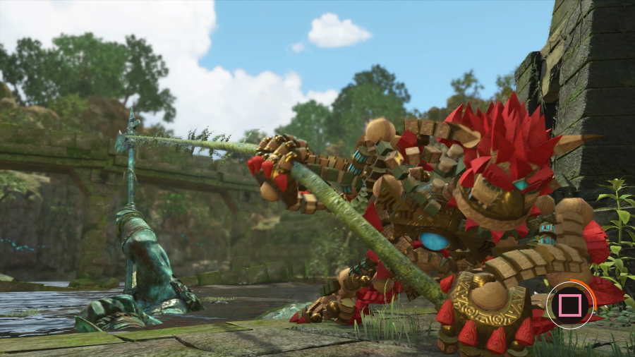 Elemental power ups are back, and they basically work the same way, acting as shields (with their own shield bar that get consumed after you get it) and powering up your hits, but this time each element has a specific use for “puzzles” (using ice to freeze enemies, switches and levers, leaving iron filings to connect electrified power stations, etc.), and now you can turn back into tiny Knack and create a statue made of the extra element to use as a weight for the puzzles. Again, this time you can tell they tried and it’s an improvement on the first one, it is.
