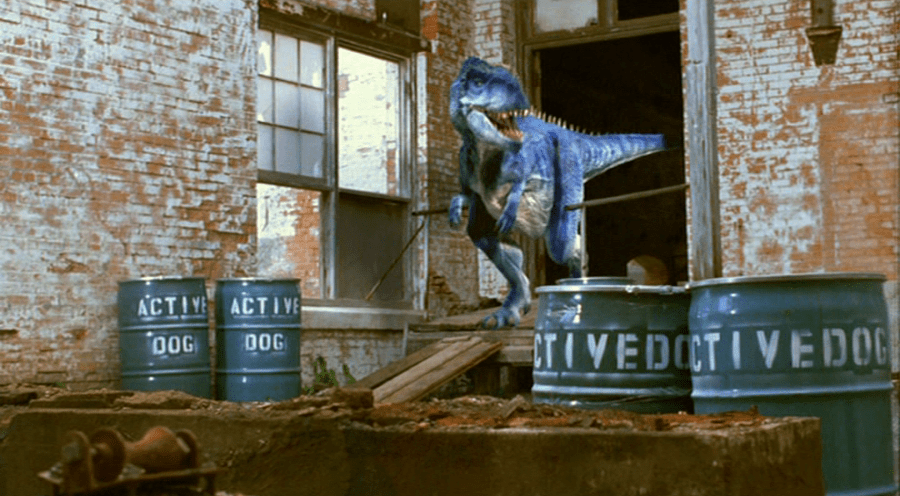 Exhibit A: the dinosaurs. They clearly didn’t have much of a budget, but for the most part, they are realized in very shit CG. When they aren’t, so you also get a distracting game of CG and cheap but not so cheap physical props, on top of the facts these fuckin dinosaurs keep changing size in every shot, now they look big towering cheap digital monsters, now tiny, weirdly colored giant lizards (one looks like a Primal Rage character), lacking any sense of weight or space. So it’s a mild consolation you don’t get just raptors, but also a T-Rex and a Megalosaurus, because they end up killing each other, otherwise this ensemble of idiots would have to actually think.