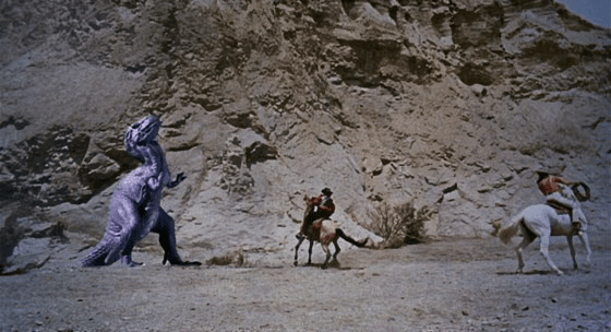 The movie is about what you expect from the concept, so it’s half western of sorts and half adventure film with dinosaurs and ancient land ripe with extinct species, it starts as “western-like” and then roughly 39 minutes in we go into the dinosaur land, neither part is great (nor that it makes any sense for the two subject matters being strung together to begin with), but the stop-motion effects for the creatures by Harryhausen are still quite fascinanting and good looking even today (as one would expect from him), and it makes for an entertaining movie, a more than decent cinematic curiosity for sure, and one of the more prominent titles of the “Weird West” subgenre.