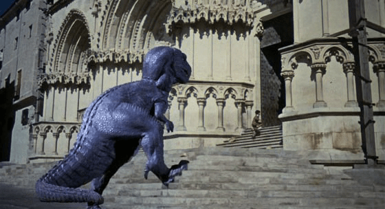 A paleonthologist and then gypsies get involved, talking about how the horse Tuck has brought for the rodeo is actually an extinct prehistoric equine, coming from the nearby Forbidden Valley, it’s cursed, so it should be brought back there. Things don’t go that well, and the parties end up in the aforemention valley, where they find more dinosaurs, and are ultimately chased by a giant Allosaurus, dubbed Gwangi. They manage to rope it down and cage it to parade in a circus-performance-rodeo (again, like King Kong) , but things don’t stay that way for long.