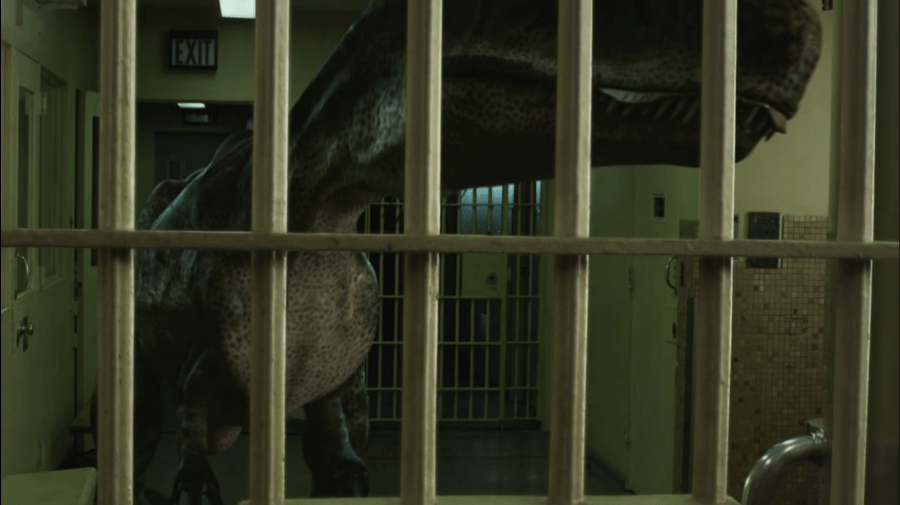 In this occasion the dinos didn’t arrive via a Stargate-style time portal, but were created in a lab and escaped a secret facility manned by a shadowy government squad, and due to an incident they bring an armored van (containing 3 Monolophosauruses, in the same genus as the T-Rex but acting as this movie’s raptors equivalent) inside a nearby prison, where they just brought a serial killer… and a trio of college girls temporarly detained (having been busted the night before at an obnoxious party). As the dinosaurs break free and kill most guards and soldiers, the girls and the serial killer and are now forced to escape deeper into the prison, bedgrudgingly having to cooperate.