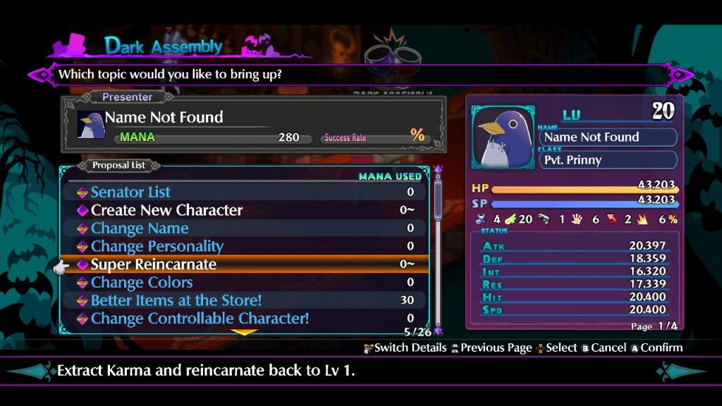 It costs 0 mana to Super Reincarnate (but it still costs Mana to create or reincarnate in a character class and you lose all Mana that character possesses when it reincarnate), but now when you do so you collect a new resource, Karma, which is used to improve the base stats, or – when you accumulated a lot – improve the character mobility, number of counter-attacks, attack range, etc.
