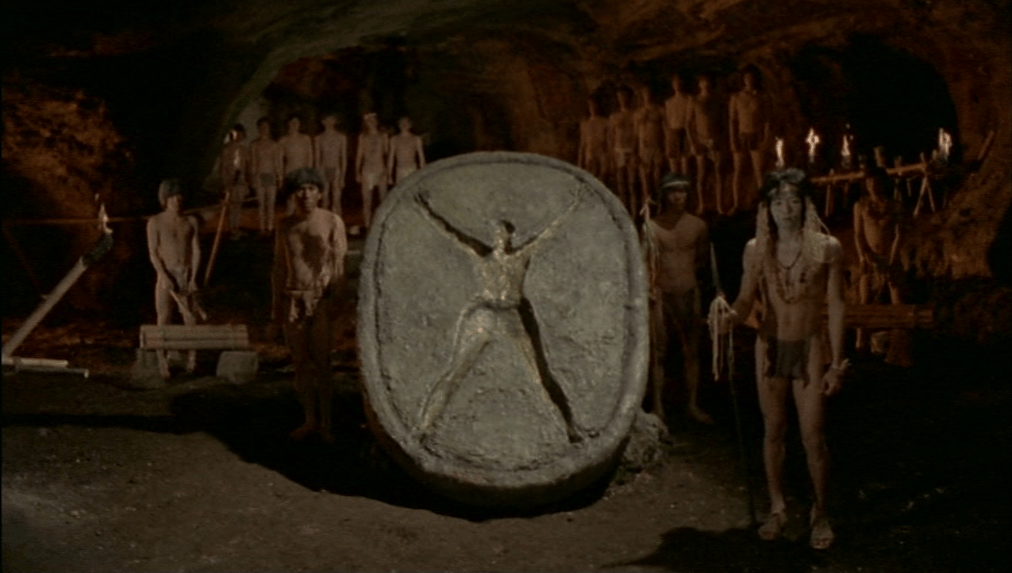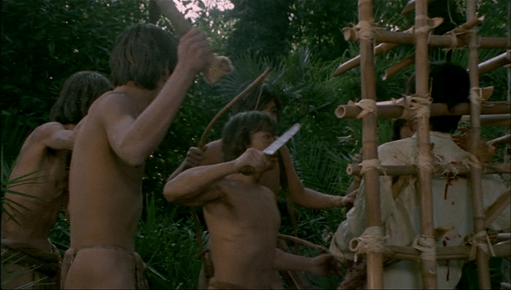 I have the italian DVD version by RaroVideo that includes six minutes of cut scenes (which also feature a literal “boob cut”, kinda random), but there’s no footage that explains that properly, so i’m just gonna go ahead and guess their god Kito elected her Queen Of The Cannibals or something.