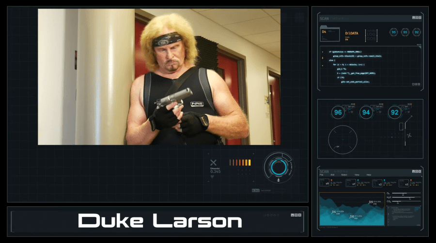 That would have been something interesting, regardless of motive, but Virus Shark is clearly against such notions as story and entertaiment and characterization, it prefers to dumps exposition narration over the characters, instead of organically introduce them, not that anything could prepare you to the middle aged soldier, Duke Larson, played by Ken Van Sant (he was also in Sharkenstein), his unkempt hair and a get up even Serious Sam would mock. He’s still the best actor in here as well.