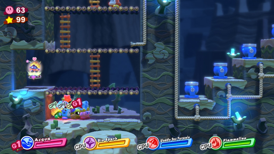 Now Kirby can launch hearts at enemy with an ability, and basically enlist it to fight alongside the pink powerpuff. You can then combine abilities with the ones your allies have, so if you have Kirby with a sword ability of sorts, you can ask mates to enbue it with ice, water, fire, but there are other ways the powers can combine to create powerful abilities, which is reminescent of Kirby 64.