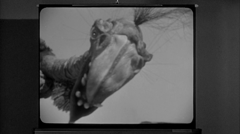Money and the lack there-of just can explain the strings on the things being quite visible in more than one shot (the restoration does help in making them even more noticeable, btw), but it’s even more absurd because they clearly wanted to creature to be terrifying and scary, but its this mohawk-clad buzzard with exaggerated cartoonish features.