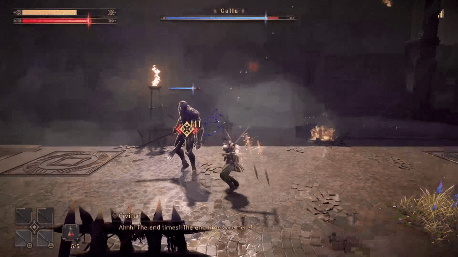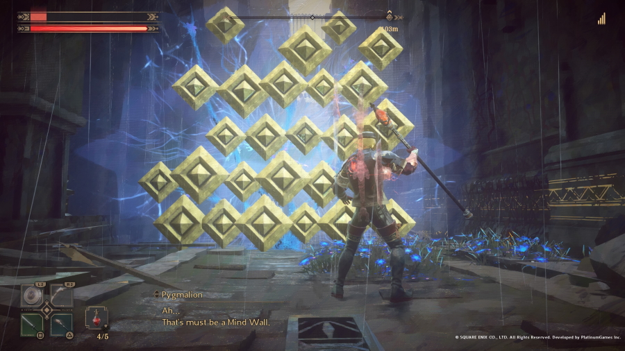 At basic, the combat in Babylon’s Fall does feel like a Platinum Games’ effort, down to timed dodging resulting in a perfect evade (here restoring part of the stamina for special attacks instead of the good old “Witch Time”), there’s an evalution screen for each battle keeping a detailed account, but its still bad because there’s no satisfaction to it, and it just barely avoids being EXTRA basic due to the Gideon Coffing thingie meaning you can equip two weapons for special attacks you can use on top of the normal combos, and regardless of your state, so you can use a spectral special attack with a hammer while downed or to keep the aggression up during a combo.