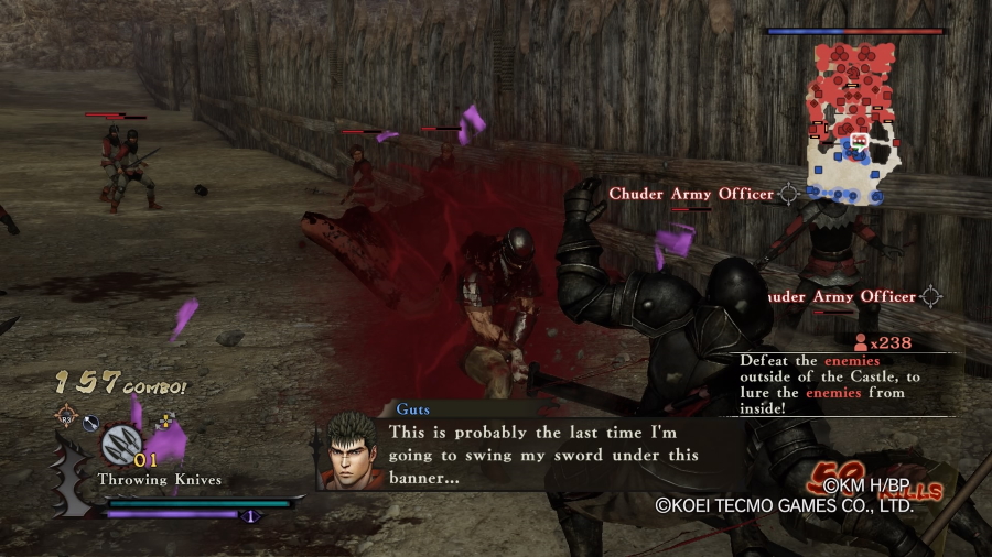 In terms of enemies, the officers here can boost themselves up in evasion, defense or attack when near death, a nice touch, but even more than some Warriors titles, Berserk and The Band Of Mutual Aid has the issue of the stronger-named enemies barely flinching. This can be alleviated by some weapon abilities, but still, both officers and boss type enemies are even harder than usual to make them flinch from your blows, and some types of enemies (like the “rape horses”) are also able to recover a small percentage of health overtime, making them an hassle more than anything.