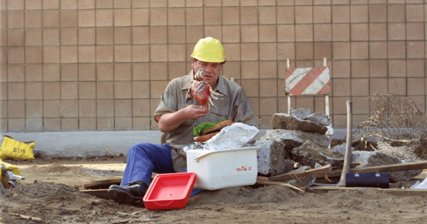 So, the movie itself definitely lives up to its reputation as a bad taste ambassadeur, as it starts with the camera zooming on a girls’ rack, which she later shows full front through a hole in the construction site’s palisade, only to retract the bahonkas before any horny worker can get a grab in.