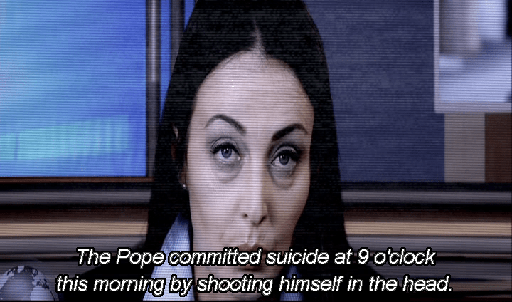 And zombi concentration camps? And the Pope just offing himself? WHAT? All of this thrown at you in the intro, too, alongside neo-nazis groups arising… which isn’t really that shocking, but helps set up cheaply the world in the brief tv montage intro, gonna throw all this shit at the viewers in a desperate effort to confuse and stun them right away, maybe putting them in the right state of mind.