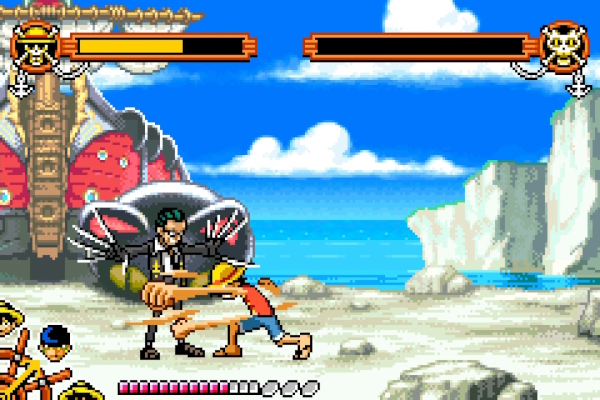 I said “contents” instead of story because there’s really not much in terms of cutscenes or narration, which is ironically for the better as the 4kids bullshit it’s held back tremendously, since the game uses a lot of assets from the Wonderswan Color game One Piece Grand Battle: Swan Coliseum (also developed by Dimps) and there’s no voice acting, so it amounts to very little, like Zoro being tied to the “non-cross” at Shells Town, Sanji’s cigarettes made infamously into lollipops and other minor stuff, like some of the collectable items you can find or obtain in levels.