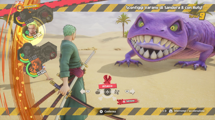 In terms of gameplay, it’s a classic styled JRPG, with turnurn based combat and a simple “rock paper scissors” system of weaknesses/resistance for the characters types (Power is extra effective against Speed, Speed to Tecnique, and Technique to Power), but also throws some more modern ideas in, as you’re not bound to use characters in the order dictated by their Speed parameter, and you have them occupying different areas of the battle zone, so – for example – if you wanna help Zoro fighting a lone basque-wearing ice monkey from a different “block” of the battle zone, you gotta first clear out enemies in your area first, or use longe range attacks.