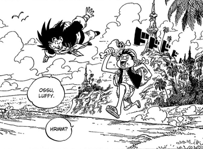 Hard to shake that feeling when the plot is basically a gag manga story in pure Toriyama style (though apparently Oda did most of the work), starting with the dragon Shenron holding a tea party for its friends after granting a wish of some guy that wanted to be king (Mr. Satan), the friends being the various characters from both series reimagined and paired accordingly, with Zoro and Piccolo being both directionless swordmen, Krillin and Chopper being train masters, or Sanji and Master Roshi being lazy lawmen that prefer chasing skirts rather than catching criminals.