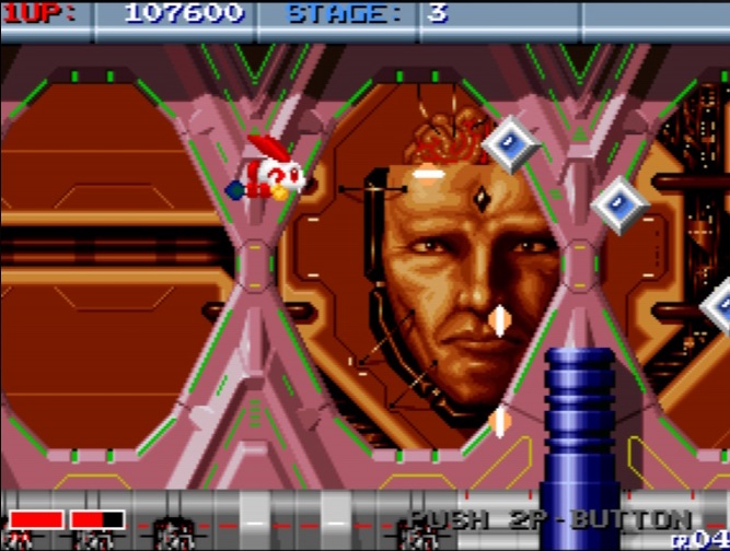 The presentation and cutscenes are quite nice, it’s all pretty typical 16-bit videogames stuff, with the parallax scrolling, the digitized english voicebits that border on incomprehensible to announce a power up or boss encounter coming up, the weirdo sci-fi setting (here mixed with fantasy stuff and weird shit that’s so old fashion japanese 2D spaceship shooter material), and overall it looks quite good for the time, music is mediocre and kinda annoying, to be blunt, but nothing abysmal.