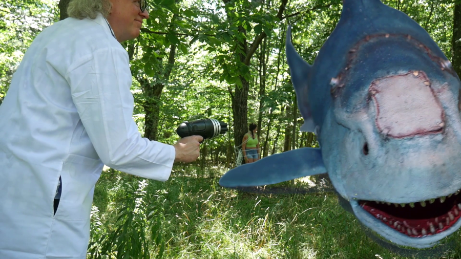 Again, makes zero sense because Sharkenstein was destroyed at the end of his own movie, but what’s a little retcon when you have absolutely run out of ideas, even stupid ones like a devil shark tied to Noah’s byblical story? So yes, as said before, Jeff Kirkendall plays the same nazi mad scientist from Sharkenstein, Klaus, not in repurposed stock footage, but newly shot material, meaning we’ll also pretend he didn’t die at the end of Sharkenstein, and now he has a “obvious air dryer repurposed as a death ray” weapon, why not?