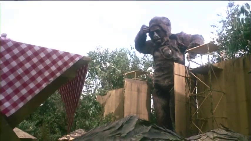 While at least the proportions are usually kept so it looks like it’s a giant ape, so at least they didn’t fuck up that much, but worry not, the optical effects are constantly awful, even for the time, arguably worse than then 40+ yo original King Kong did.