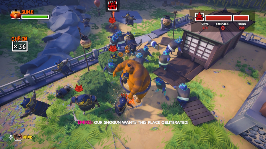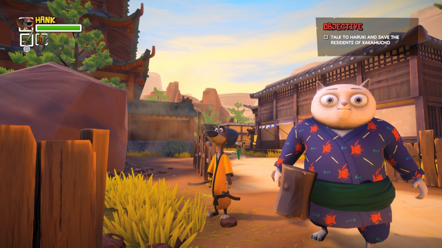 There are 3 little open hub where to access the village raids and samurai runs, with some platforming gimmicks like the rail grinding to speedily reach other parts of the hub, place for the grapple to latch on, sidequests involving talking to NPCs, fetching collectables, collectable wooden cat targets to shoot at, and some platforming challenges, plus shops where to spend the cat money on cosmetic items for Hank… and Jimbo, since after the intro you can play local co-op