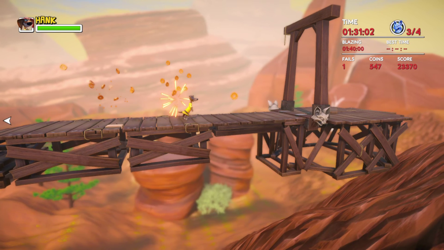 These are basically 2.5D platforming challenges in which you race Jimbo to the finishs line, and while they offer some variety (and the sidescrolling view means reprise from the awful camera of the main game modes) and aren’t actually bad, all things considered, it becomes obvious fairly soon the game wasn’t built around or for this, since the double jump kills almost all momentum for Hank, in a trial race where you have to constantly double jump and air dash….unless you get a speed power up, that is, but relying on a power up to fix some stiff jumps isn’t ideal either.