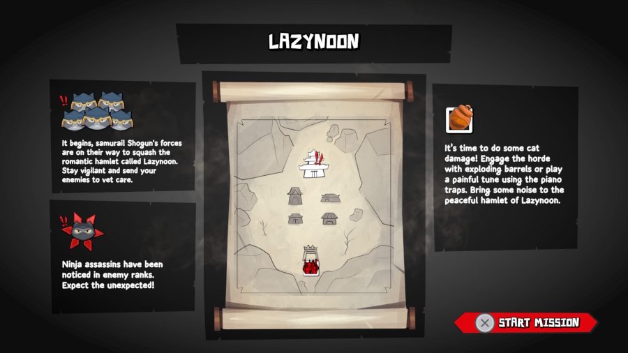 That would be the village raids, tower defense sections where you have to defend one or more temples from waves of samurai cats (of the non-pizza variety) by collecting coins to activate or replenish traps like falling pianos on a wire, explosive barrells, fireworks displays or stands of explosives, getting consumable weapons like hammer or special arrows, and actively fighting the hordes in sword combat.