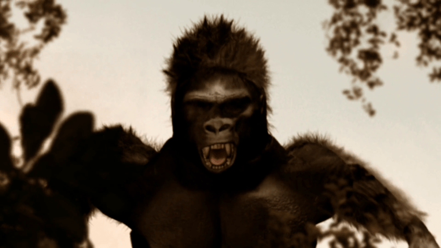 Speaking of the monkey, it show ups early….. but it’s also hidden at the same time, because the effects are so bad and it’s shown in such quick cuts you can’t even screenshot the darn thing to see any detail of this “vague blurry giant monkey” thing that showed up on screen for a second. Even when it’s finally shown properly (in the last 10 minutes)…it still looks quite blurry.
